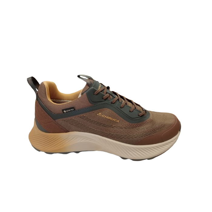 Un zapato de material sintético, detalles en alta frecuencia, refuerzo en puntera y trasera, membrana Gore-Tex impermeable y transpirable; suela dos densidades con entresuela de phylon y suela de goma que proporciona amortiguación y comodidad.