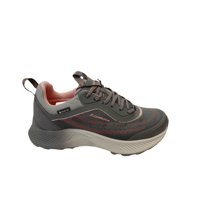 Un zapato de material sintético, detalles en alta frecuencia, refuerzo en puntera y trasera, membrana Gore-Tex impermeable y transpirable; suela dos densidades con entresuela de phylon y suela de goma que proporciona amortiguación y comodidad.