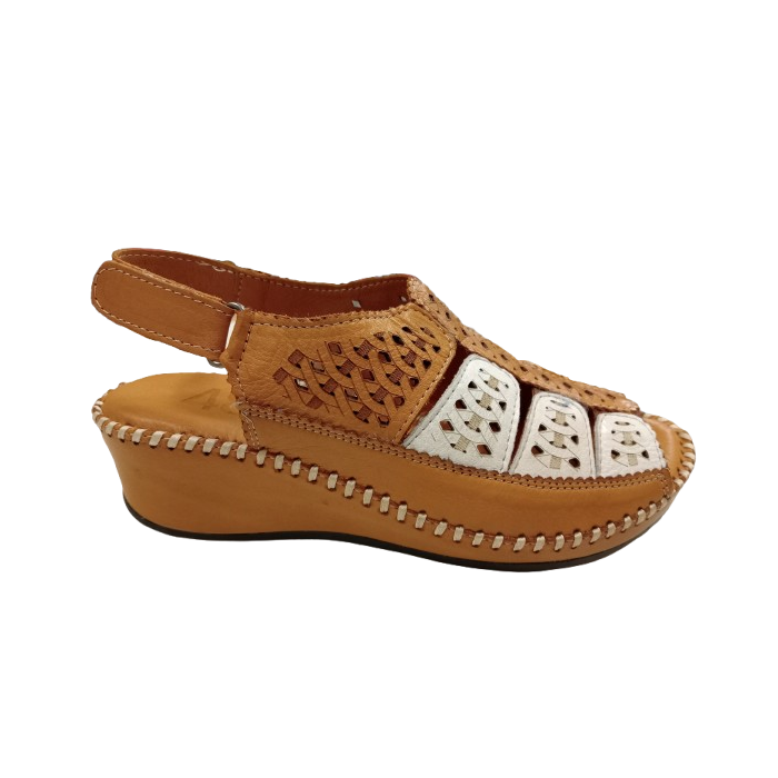 Sandalia 100% en piel con cierre de velcro, plantilla extra acolchada y ligero piso cosido y antideslizante con unos 5cm de cuña y 2cm. de plataforma.